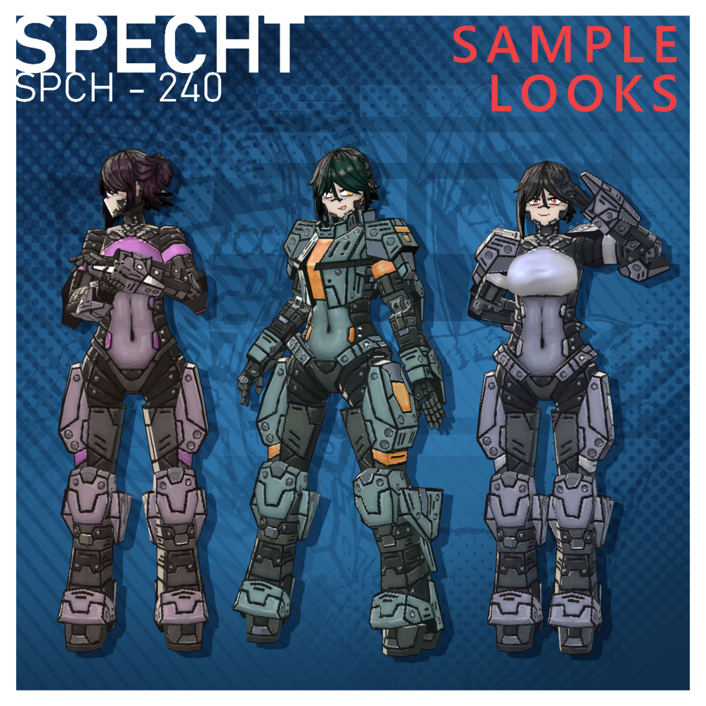 When a planet capable of habitation gets discovered and gets processed for Colonization, many citizens voice concerns about the dangerous terrain and unknown beings that lie within the planet. Due to that came with the development of the Specht units, based of chassis from a versatile combat model modified with heavy armored limbs for Mobility and Durability. These capable scouts are able to traverse any terrain and can withstand any extreme weather, with each unit equipped with a utility hatchet and a long-range blaster, which can help improve the unit's survivability within the planet's ecosystem.
